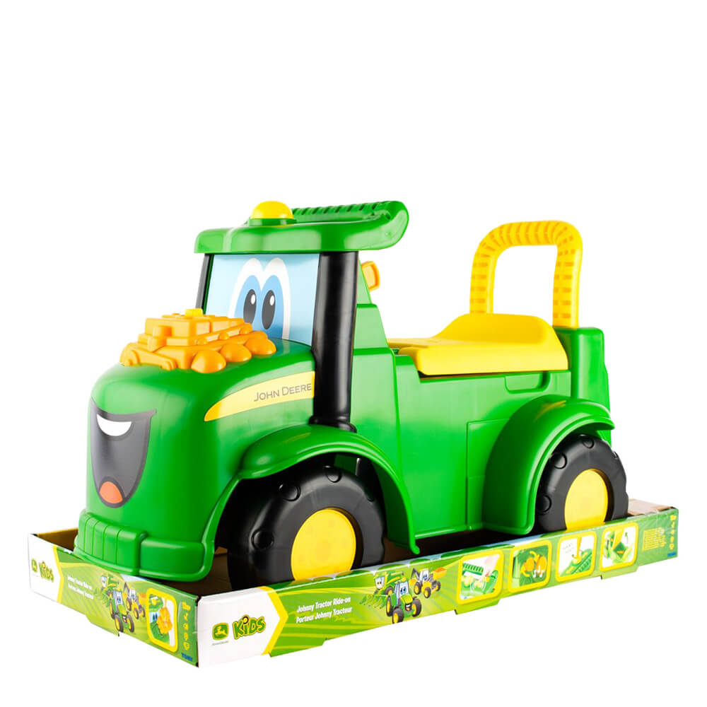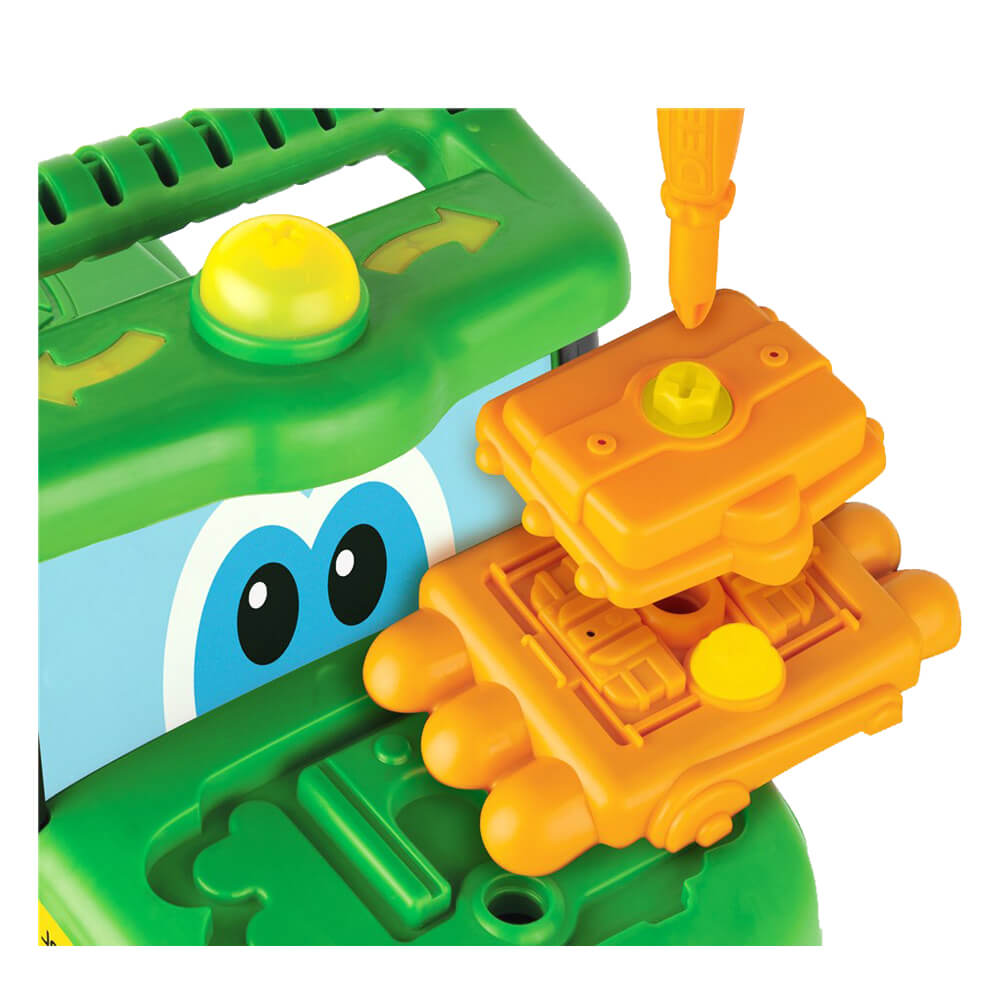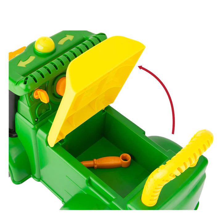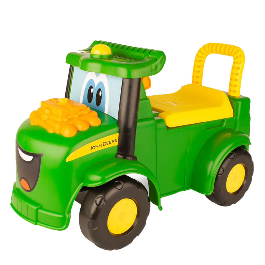 The John Deere Johnny Tractor Foot to Floor is a ride on toy that gives toddlers a fun way to get around! This happy tractor features plenty of activities for your little one. The included screwdriver can be used to take Johnny's engine apart and put it together again for take apart play, or turn the GPS with the screwdriver for fun clicking sounds. Pressing blinker buttons activates lights, or honk the horn and turn the key for engaging farm tunes and sounds. The driver's seat opens up and is a great place to stow the screwdriver or favourite toys that want to come along for the ride. The tractor comes complete with 3 AAA batteries so that the fun can start right away!